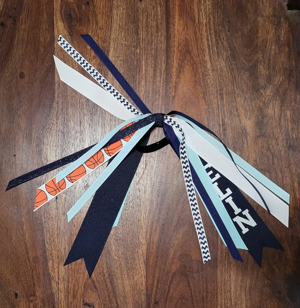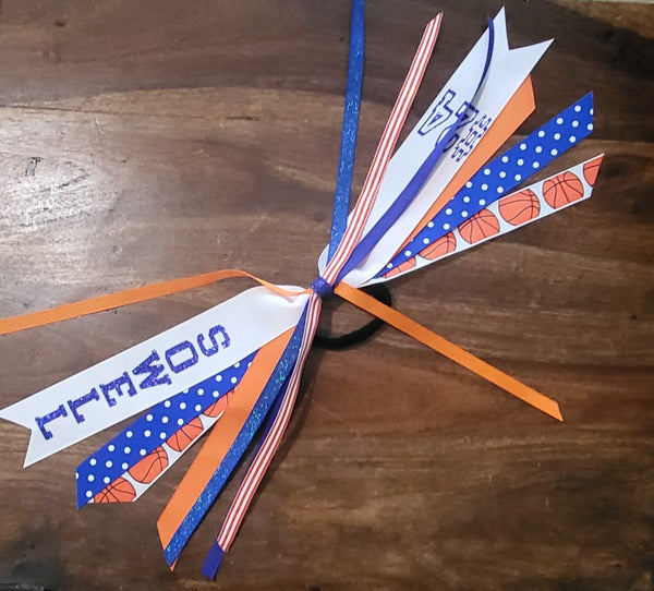 8 ribbons attached. 1.5 inch wide grosgrain ribbon with Glitter name and number. BASKETBALL ribbon will stay all other ribbons can be changed.