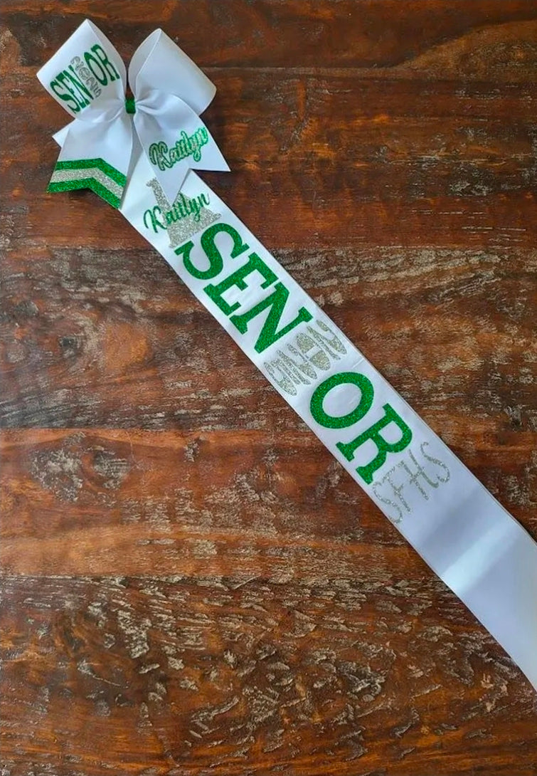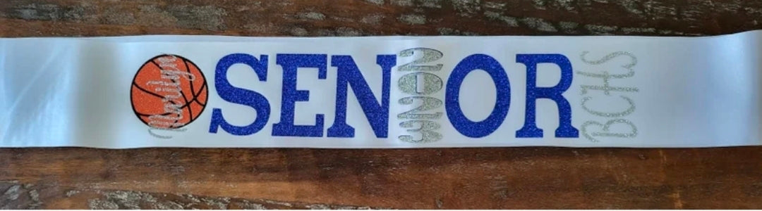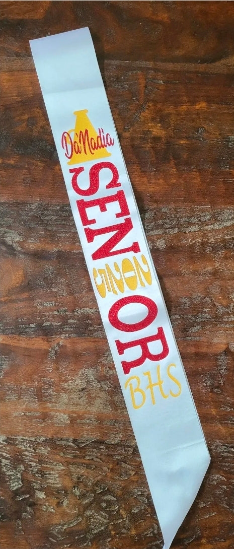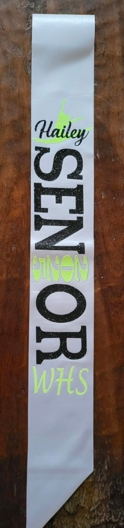 White Satin Senior Sash with Glitter HTV attached.