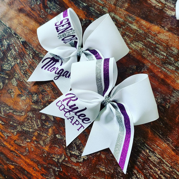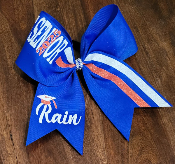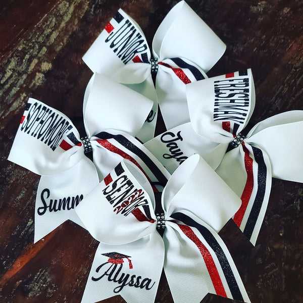 3 inch wide grosgrain ribbon with Glitter HTV attachedBows are made stiff.Bow measures approximately 8 x 7Hair tie attached.Please leave name and year. Name will be in cursive font, unless instructed otherwise.
